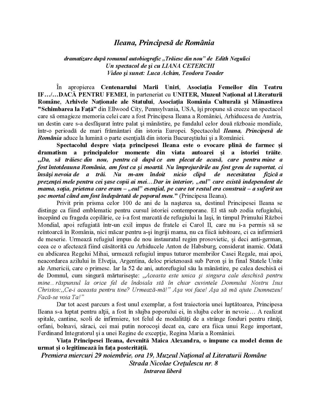 spectacolului „Ileana, Principesa de Romania”, inspirat de romanul autobiografic „Traiesc din nou”.